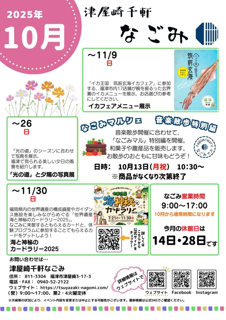 筑前玄海エリアで開催される『イカ王国 筑前玄海イカフェア』に参加する17店舗のメニュー展示、福津の美しい夕日の風景を紹介する展示のほか、「音楽散歩」に合わせて開催の「なごみマル」特別編、11月末まで開催の「世界遺産 海と神秘のカードラリー2025」などを掲載しています。
