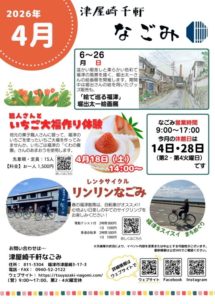 温かい眼差しと柔らかい色彩で福津の風景を描く、堀出太一さんの絵画展、「職人さんといちご大福作り体験」、レンタサイクルの情報などを紹介しています。